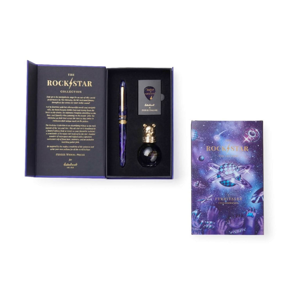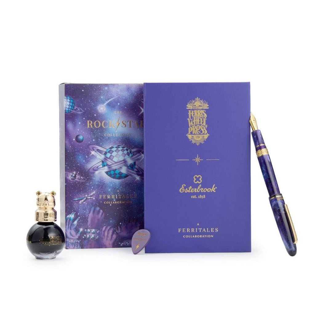 Zum Set gehört eine eigens entwickelte Spezialtinte, die die gemeinsame Designsprache von Esterbrook und Ferris Wheel Press aufgreift. Das Tintenfläschchen trägt den ikonischen Bear Cap und fügt sich perfekt in das Gesamtbild ein, das zusätzlich durch ein thematisches Gitarrenplektrum abgerundet wird. All dies ist in einer hochwertig gestalteten Collector’s-Box arrangiert.